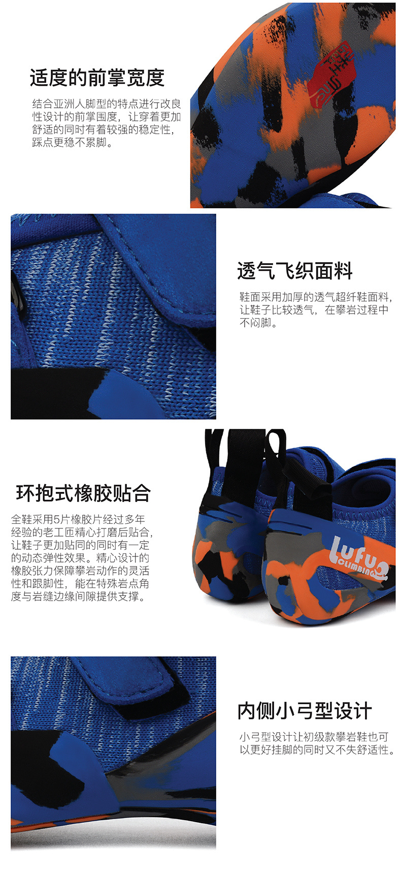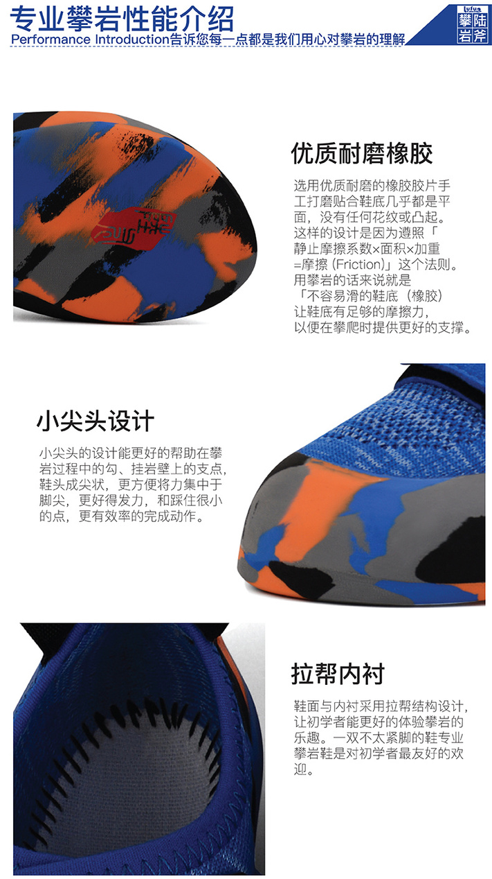 靴全体は5枚のゴムでできており、長年の経験を持つベテラン職人によって慎重に磨かれ、フィットされた靴は安定性が高まり、特定の動的弾性効果が得られます。慎重に設計されたゴムの張力は、クライミングの動きの柔軟性とヒールリングを保持し、特別なポイントの角度とホールドのエッジ間をサポートを提供できます。